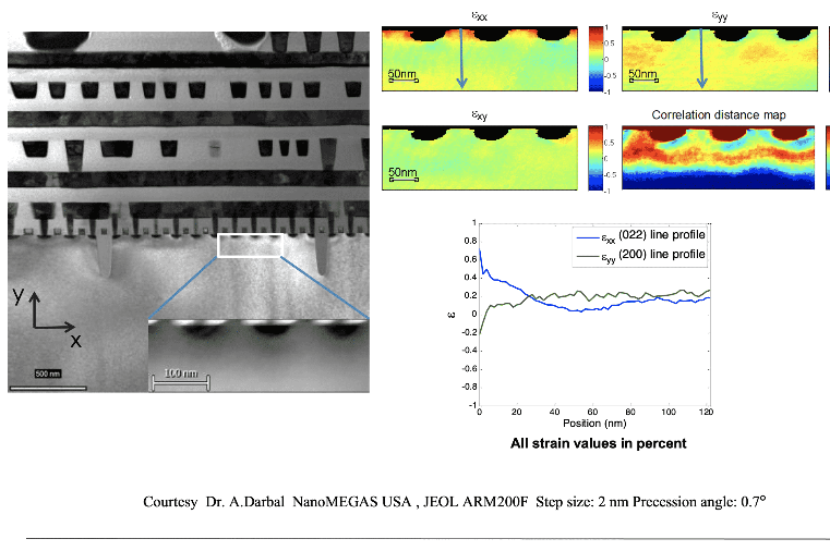 Novel Automated Strain Mapping Solution for TEM/STEM (Patent pending) based on nanobeam precession diffraction patterrns in combination with DigiSTAR. Precision up 0.02% (200kV FEG) with spatial resolution up to 2nm attainable (FEG-TEM). Measurement of strain with high spatial resolution and high precision in semiconductor devices is critical to monitor the designed and unintended strain distributions.